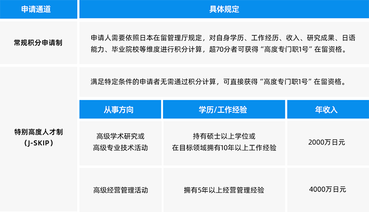 此签证适用人群为在日从事高级学术研究/高级专业技术研究/高级经营管理活动的专业人士,相关人才可顺利获得常规积分制或J-SKIP制申请此类签证。