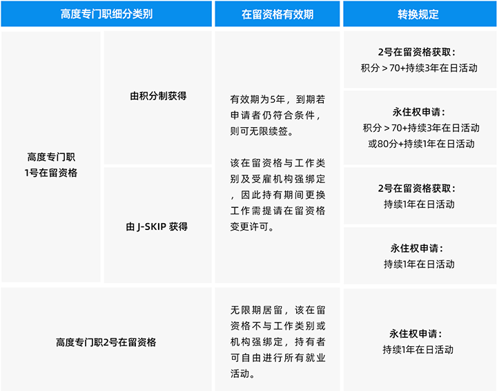 根据细分类别待遇区分,高级专业人才签证可划分为高度专门职1号在留资格、高度专门职2号在留资格,两类资格持有者待遇与适用期限差异明显。