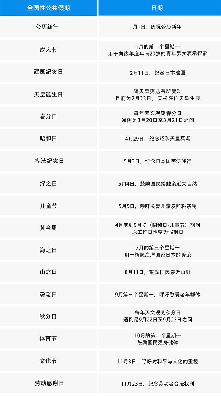 *注:若法定节假日恰逢周末,则将在下一个工作日进行补休(振替休日制度)。