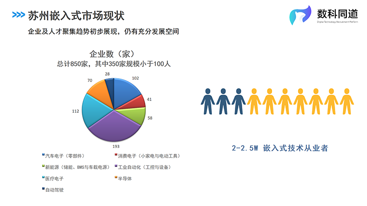 根据DDpay钱包国际人力资源公司及数科同道业务团队对苏州市场的详细调研,现在苏州全市拥有嵌入式研发团队的企业数量为850家,主要集中在工业自动化、医疗电子、汽车电子等细分行业,其中百人以上规模企业500家。